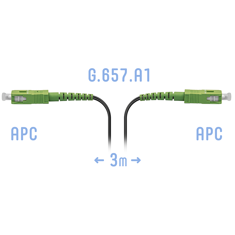 Патчкорд FTTH SC/APC-SC/APC представляет собой отрезок одноволоконного FTTH-кабеля, усиленного двумя FRP-прутками (Fiber Reinforced Plastic), длиной 3 метра, оконцованный с двух сторон оптическими коннекторами SC, тип полировки - APC (Angled Physical Contact). В данных патчкордах используется одномодовое волокно с уменьшенными потерями на изгибе G.657.A1.