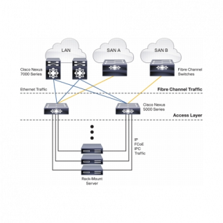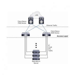 Коммутаторы Cisco Nexus 5548, разработаные в конфигурации с высокой плотностью портов, производительностью, охлаждением спереди назад и расположением портом на задней стороне, идеально подходят для агрегации большого числа 10 Gigabit Ethernet соединений от серверов в меньшее число аплинков до агрегирующих коммутаторов. Плотность портов коммутатора позволяет каждому коммутатору подключать целую стойку или соседние стойки используя SFP+ медные кабели. Коммутаторы Cisco Nexus 5548 можно купить с Ethernet возможностями, что позволяет департаменту ИТ устанавливать их параллельно существующим Fibre Channel сетям хранения. Вместо использования множества Gigabit Ethernet соединений серверов к LAN, приложениям мобильности виртуальных машин, iSCSI для доступа к сетям хранения, заказчик может объединить весь трафик в консолидированную сеть 10 Gigabit Ethernet, без потерь, с низкой задержкой.