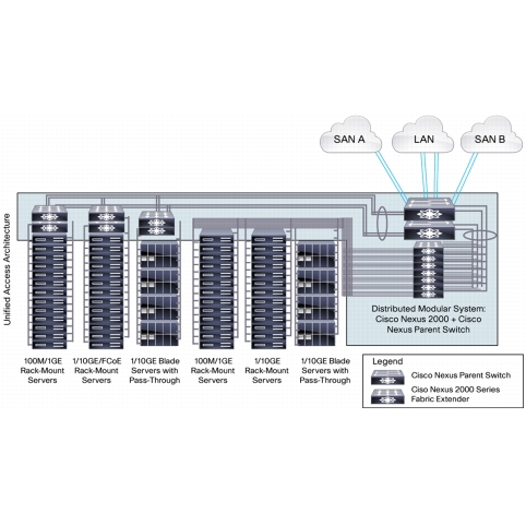 Один из сценариев использования предусматривает установку в каждую стойку центра обработки данных двух Cisco Nexus 2200 Fabric Extender, подключенных к двум коммутаторам семейства Cisco Nexus 5548. К каждому Fabric Extender можно подключить до 48 серверов по 100/1000BASE-T, 1- 10GE/ FCoE (SFP+), 1- 10G Base-T, 1- 10G Base-KR (SFP+).